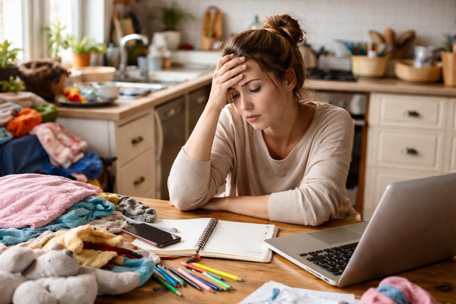 Il problema non è fare tante cose. Il problema è farle tutte contemporaneamente senza chiuderne una. Il cervello passa continuamente da un compito all’altro: inizi a piegare i panni, poi controlli il forno, poi rispondi a una chat della scuola, poi torni ai panni ma nel frattempo hai dimenticato dove eri rimasta.